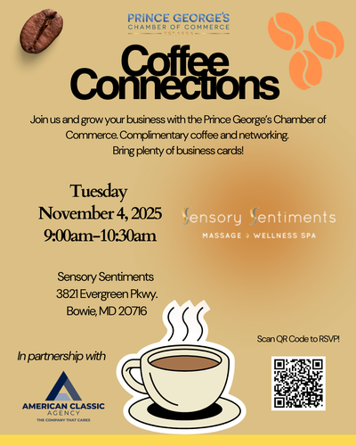 Join us for a morning of networking and delicious coffee. This monthly in-person event is an excellent opportunity to make business connections in Prince George’s County, MD. PGCOC Coffee Connections is a monthly networking event that brings together a diverse group of businesses, entrepreneurs, startups, and the local community. It's a platform to network, share ideas, and make the right connections to grow your business. Join us for an hour to share information and connect within the business community. Come and learn what the Prince George's Chamber of Commerce is all about! Registration is suggested but not required to attend Coffee Connections. “Let's Make Connections.” Tuesday, November 4, 2025
