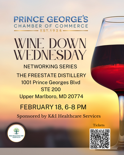 PGCOC Wine Down Wednesday Sip. Celebrate. Connect. Join the Prince George’s Chamber of Commerce for our signature networking series — Wine Down Wednesday — where good wine meets great connections. A special thank you to K+I Healthcare Services, our event sponsorwho is transforming healthcare and improving community well-being. Date: Wednesday, February 18, 2026 Time: 6:00 PM – 8:00 PM Location: The Freestate Distillery, 1001 Prince Georges Blvd STE 200, Upper Marlboro, MD 20774 Tickets: $25 Members | $35 Non-Members (includes glass of wine & light bites) What to Expect: Let’s raise a glass to progress, partnerships, and possibilities! Reserve your spot today — space is limited!.png)
